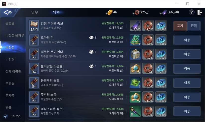 ▼ 미르4 비천성 의뢰 퀘스트 목록 ▼
