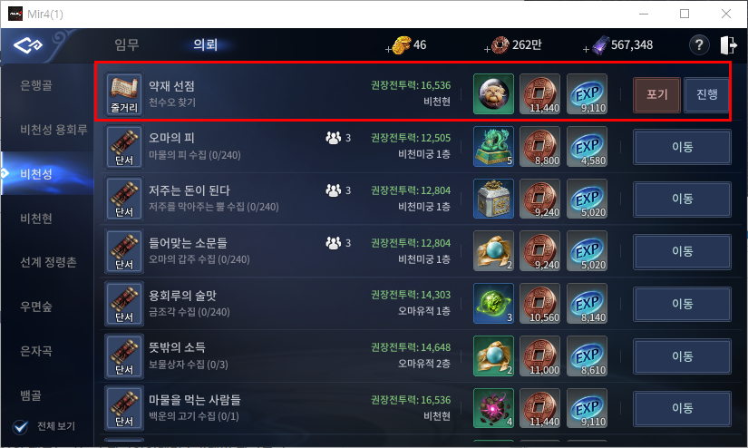 ▼ 미르4 비천성 의뢰 퀘스트 목록 ▼