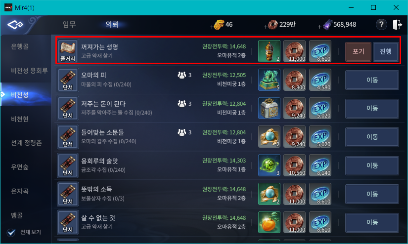 미르4 꺼져가는 생명 의뢰 - 고급 약재 찾기