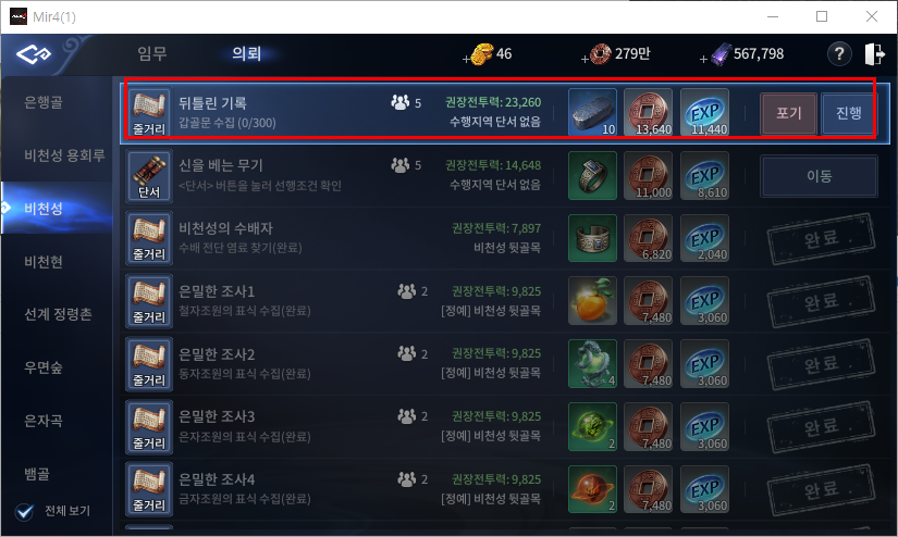 모든 의뢰 퀘스트는 줄거리 및 단서를 잘 살펴보셔야 합니다. 줄거리를 보면 난이도 A 등급이라고 표시가 되고 있습니다. 퀘스트 수행 위치는 비천비곡입니다.